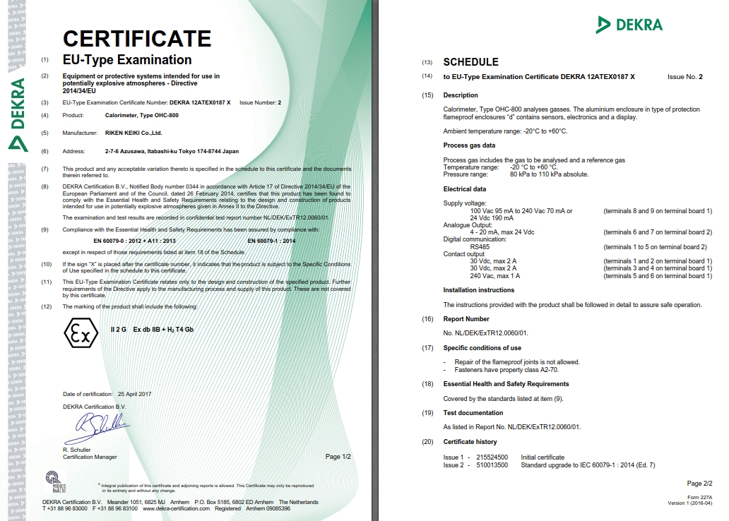 ATEX証 OHC-800 DEKRA12ATEX0187X Issue No.2
